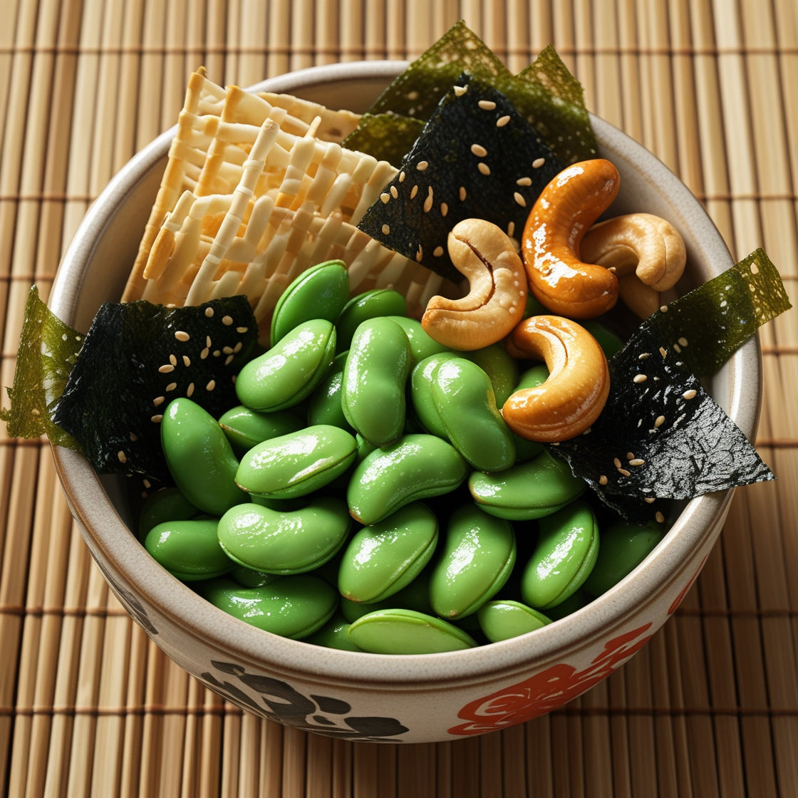 Expertly crafted, our Umamix Graze combines roasted edamame, sesame rice crackers, miso-glazed cashews, and nori chips for a sophisticated Japanese-inspired snacking experience. Each element contributes distinct textures and umami notes, creating a complex flavor profile that evolves with every handful. This 7.5 oz blend delivers a satisfying alternative to conventional snack mixes.
